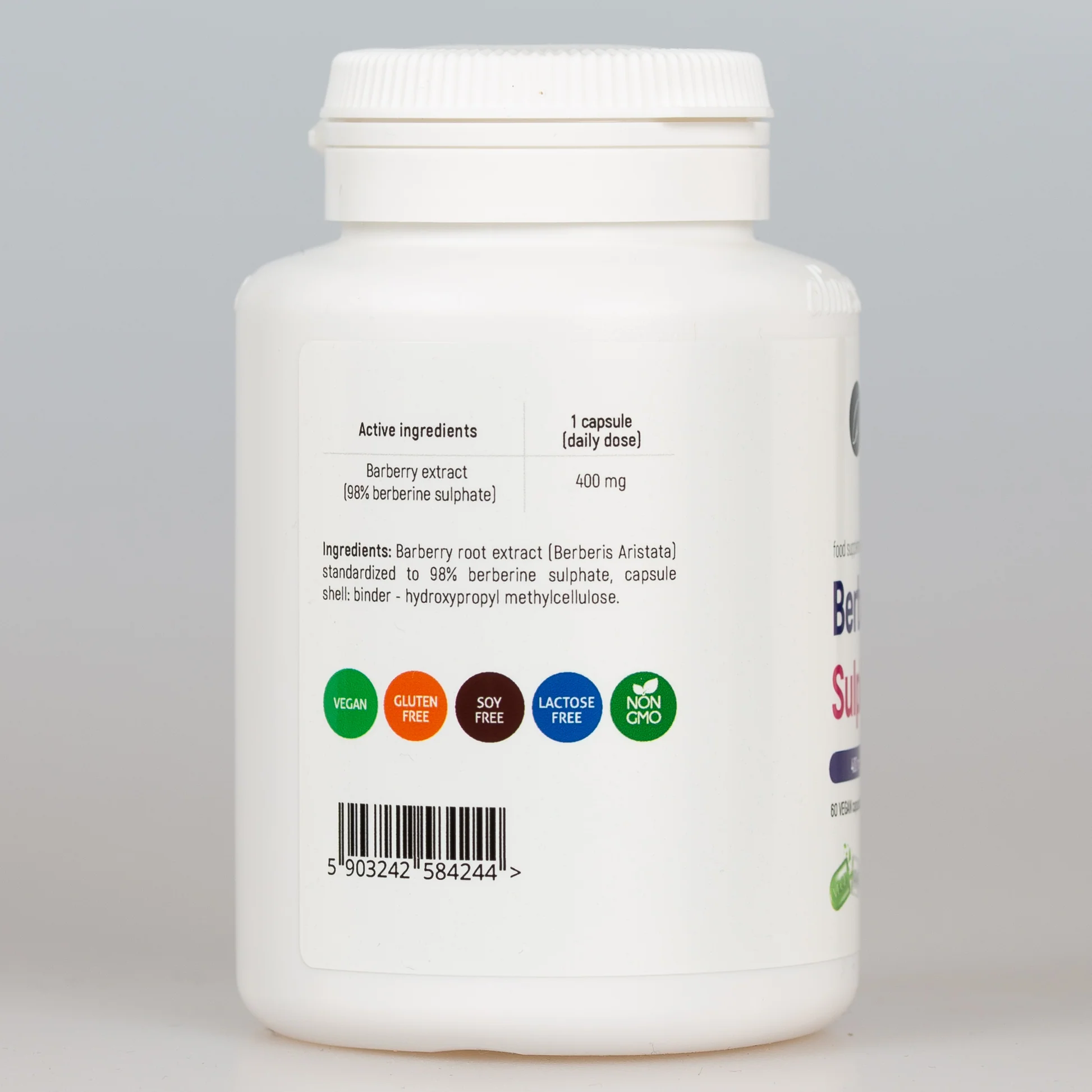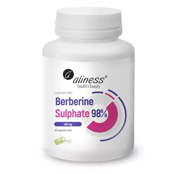 Aliness Berberine Sulphate 98% 400 mg (60 kapsułek) to suplement diety zawierający wysokiej jakości ekstrakt z berberyny siarczanowej, standaryzowany na 98% czystości. Berberyna to naturalny składnik roślinny występujący m.in. w berberysie, od wieków obecny w tradycyjnych praktykach żywieniowych.