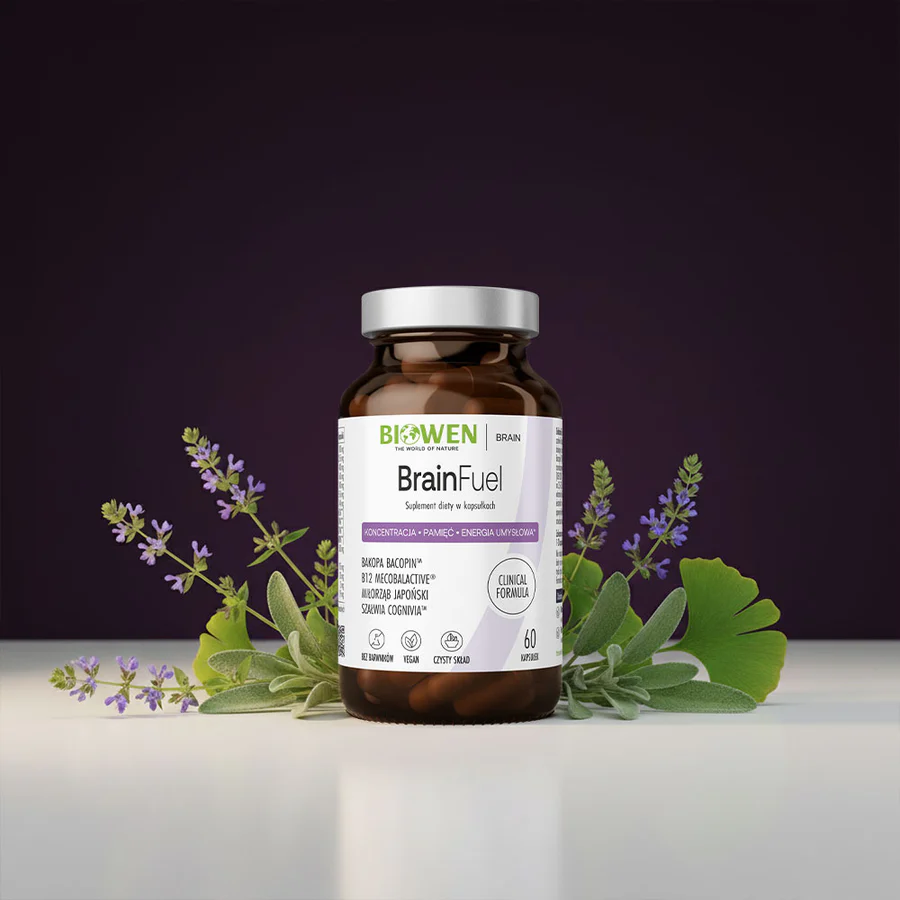 BrainFuel Biowen to suplement diety stworzony z myślą o osobach, które chcą wspierać pamięć, koncentrację i naturalną energię dla mózgu. W szybkim tempie życia — pełnym obowiązków, stresu i rozpraszaczy — wiele osób doświadcza spadku koncentracji, trudności z zapamiętywaniem czy tzw. „mgły mózgowej”, dlatego BrainFuel powstał, aby wspierać codzienną sprawność umysłową. Zawiera Bacopin™, Tinofolin®, Ginkgo biloba, Cognivia™ oraz witaminy z grupy B, które wspierają procesy poznawcze, krążenie mózgowe i odporność psychiczną. To doskonały wybór dla osób pracujących umysłowo, uczących się, żyjących dynamicznie oraz wszystkich, którzy chcą poprawić jasność myślenia i efektywność intelektualną każdego dnia.