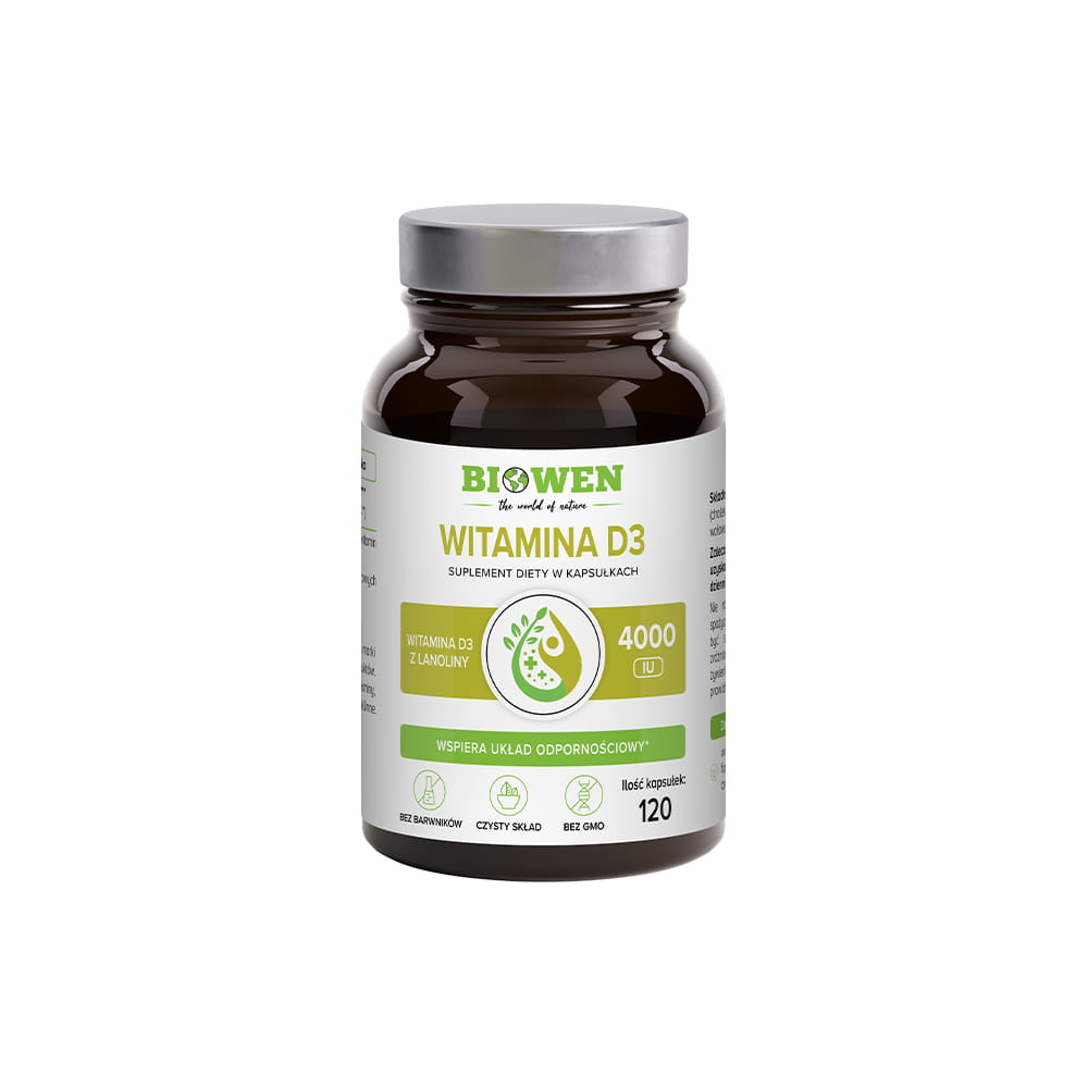 Witamina D3 Biowen to suplement diety oparty na naturalnej witaminie D3, pozyskiwanej z lanoliny i zamkniętej w kapsułkach z żelatyny wołowej. Produkt nie jest odpowiedni dla wegetarian i wegan. Witamina D3 Biowen pomaga utrzymać właściwy poziom tej witaminy w organizmie, oferując formę łatwą do przyswojenia.