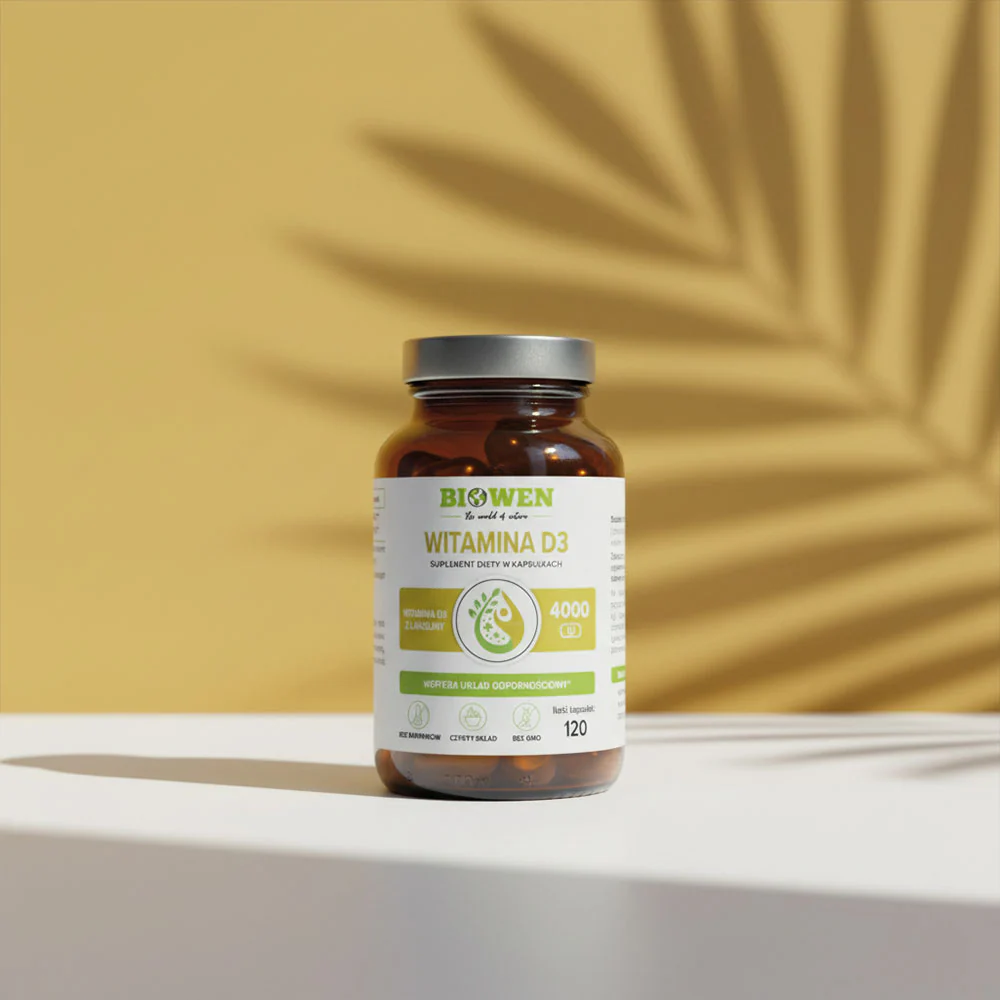 Witamina D3 Biowen to suplement diety zawierający naturalną witaminę D3 pozyskaną z lanoliny i rozpuszczoną w oliwie z oliwek dla lepszej przyswajalności. Każda kapsułka dostarcza 4000 IU – wysoką dawkę, która wspiera odporność, zdrowie kości i mięśni oraz prawidłowy podział komórek. Produkt przeznaczony jest dla osób, które chcą uzupełnić niedobory witaminy D3, szczególnie w okresie jesienno-zimowym, przy małej ekspozycji na słońce czy intensywnym trybie życia.