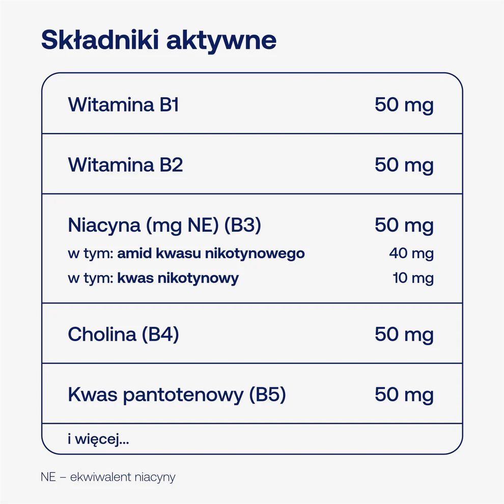 Kompleks 11 witamin z grupy B w wysoko przyswajalnych formach, w tym metylowany folian i B12, wzbogacone o cholinę, inozytol i PABA.