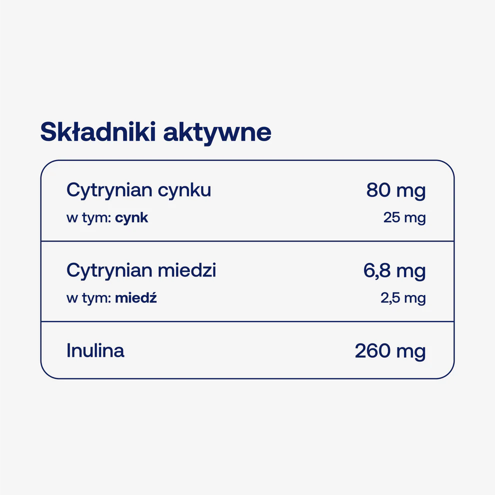 Składniki: Inulina (korzeń cykorii), cynk (cytrynian cynku), pullulan (otoczka kapsułki), miedź (cytrynian miedzi).