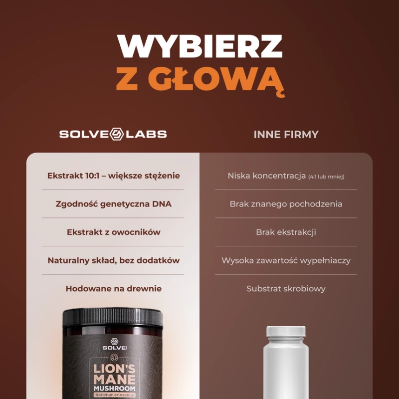 Poznaj Solve Labs Lion’s Mane - wysokiej jakości ekstrakt z soplówki jeżowatej (Hericium erinaceus), znanej jako grzyb mądrości. To naturalny nootropik i adaptogen, który wspiera pamięć, koncentrację, kreatywność oraz zdrowie układu nerwowego. Idealny wybór dla osób pracujących umysłowo, studentów i wszystkich, którzy chcą poprawić swoją produktywność w naturalny sposób.