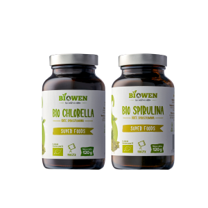 Zestaw superfoods Biowen - BIO Spirulina 120 g + BIO Chlorella 120 g - dwa wyjątkowe algi z certyfikowanych, ekologicznych upraw. To naturalne źródło chlorofilu, witamin, minerałów i roślinnego białka. Idealne do codziennego wsparcia organizmu, oczyszczania, witalności i odporności. Bez sztucznych dodatków, barwników i wzmacniaczy - 100% natury w proszku.
