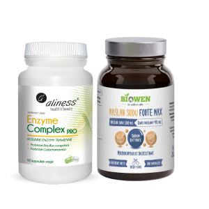 Zestaw na układ pokarmowy składający się z Biowen Maślan Sodu Forte oraz Aliness Enzyme Complex PRO został opracowany z myślą o osobach, które chcą kompleksowo wspierać fizjologiczne procesy trawienne oraz naturalne funkcje jelit. To połączenie dwóch uzupełniających się suplementów, które dostarczają zarówno enzymów trawiennych, jak i substancji wspierających równowagę mikroflory jelitowej.